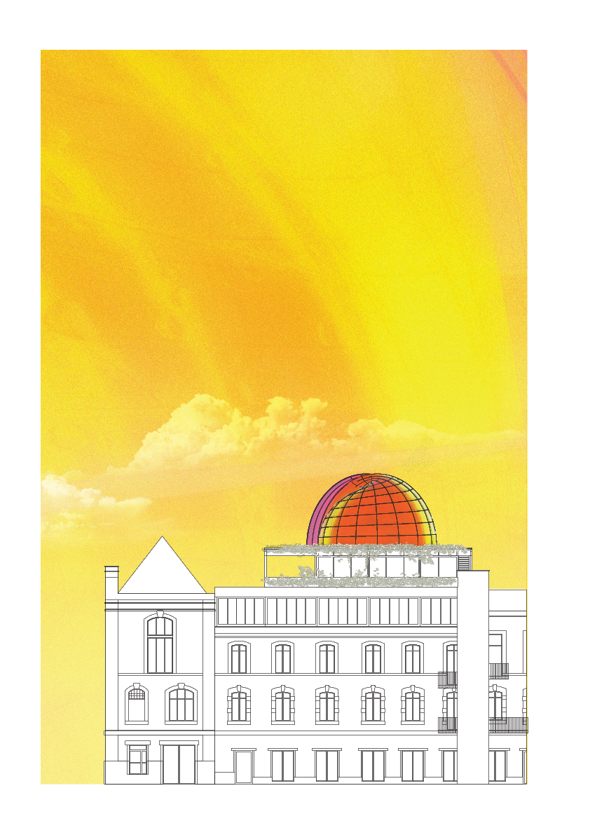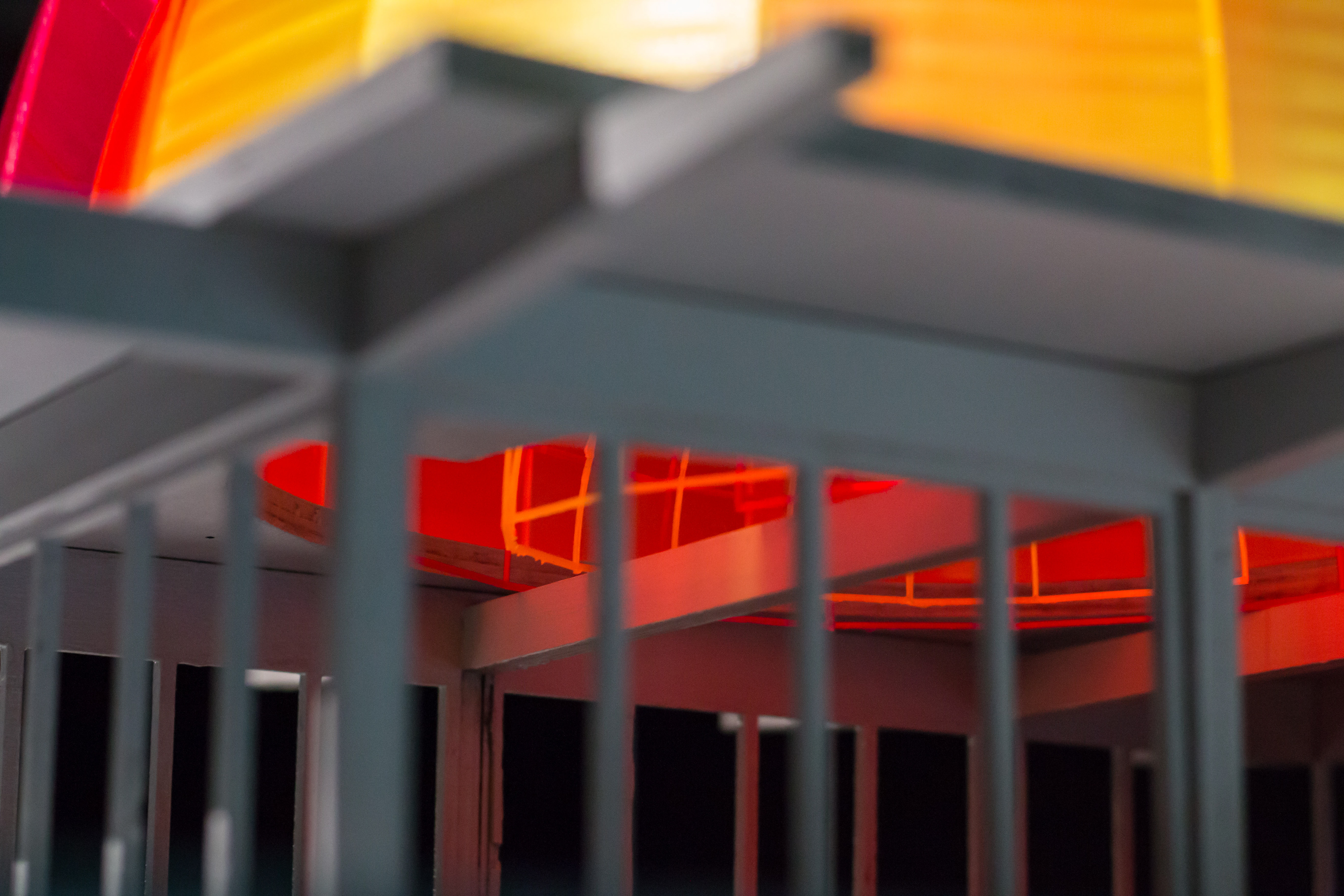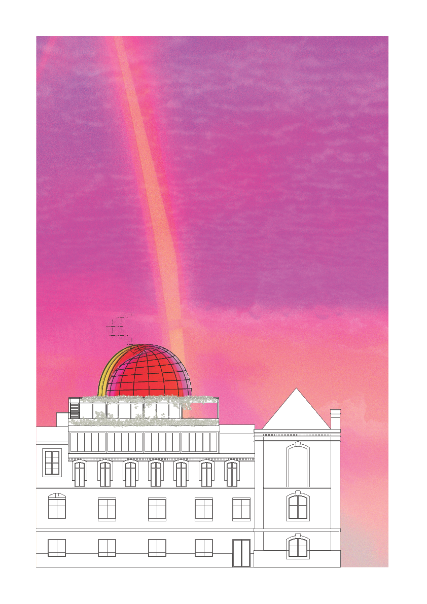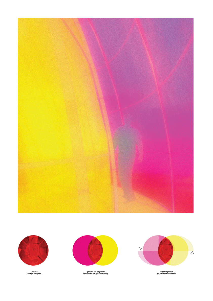 As an extension of the planned co-innovation space in the former Ankerbrotfabrik in Vienna, the declared aim of this project was to create a place of balance that brings people and bees into interaction. In this context, the idea arose to make use of the visual perception of bees. Since bees cannot see red light, a space was designed that only lets red light in through subtractive colour overlays, while ensuring a general permeability for the bees' flight. For deceleration, a spiral path was chosen that leads through two formally identical twisted structures, one covered with magenta and the other with yellow foil. The inner space, bathed in red light, is perceived as dark by the bees, while humans perceive it as red. This creates a space where bees feel calm and can build their nests on the inner structure, while humans can use it for meditation classes and other activities.