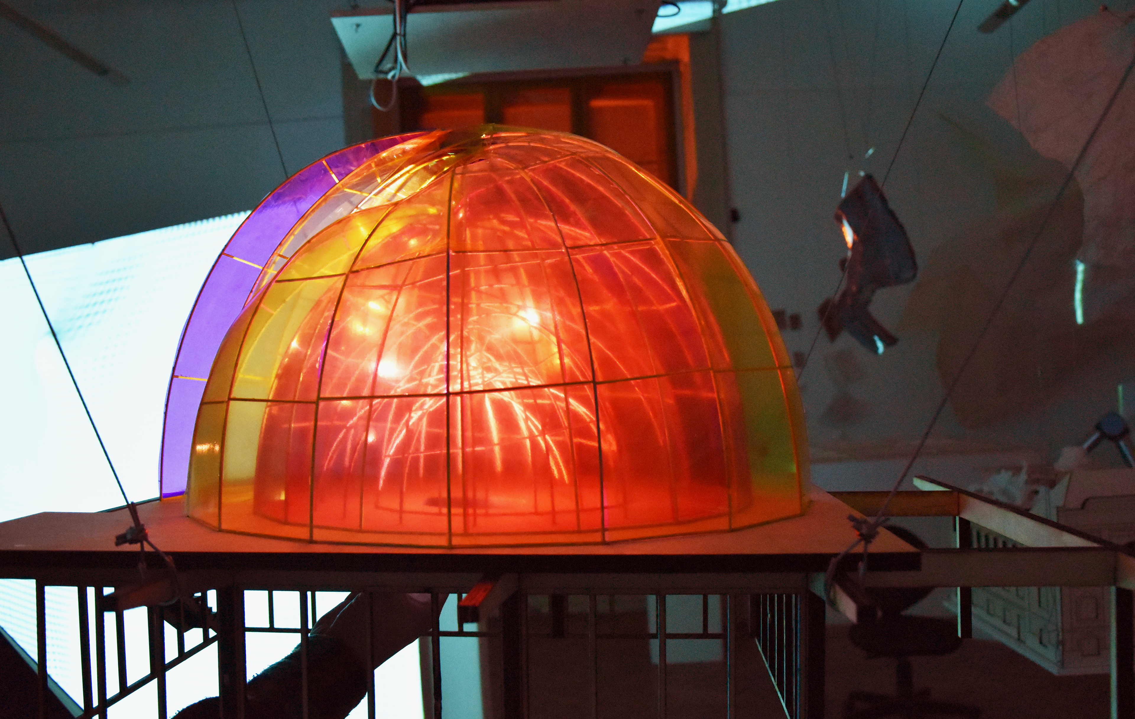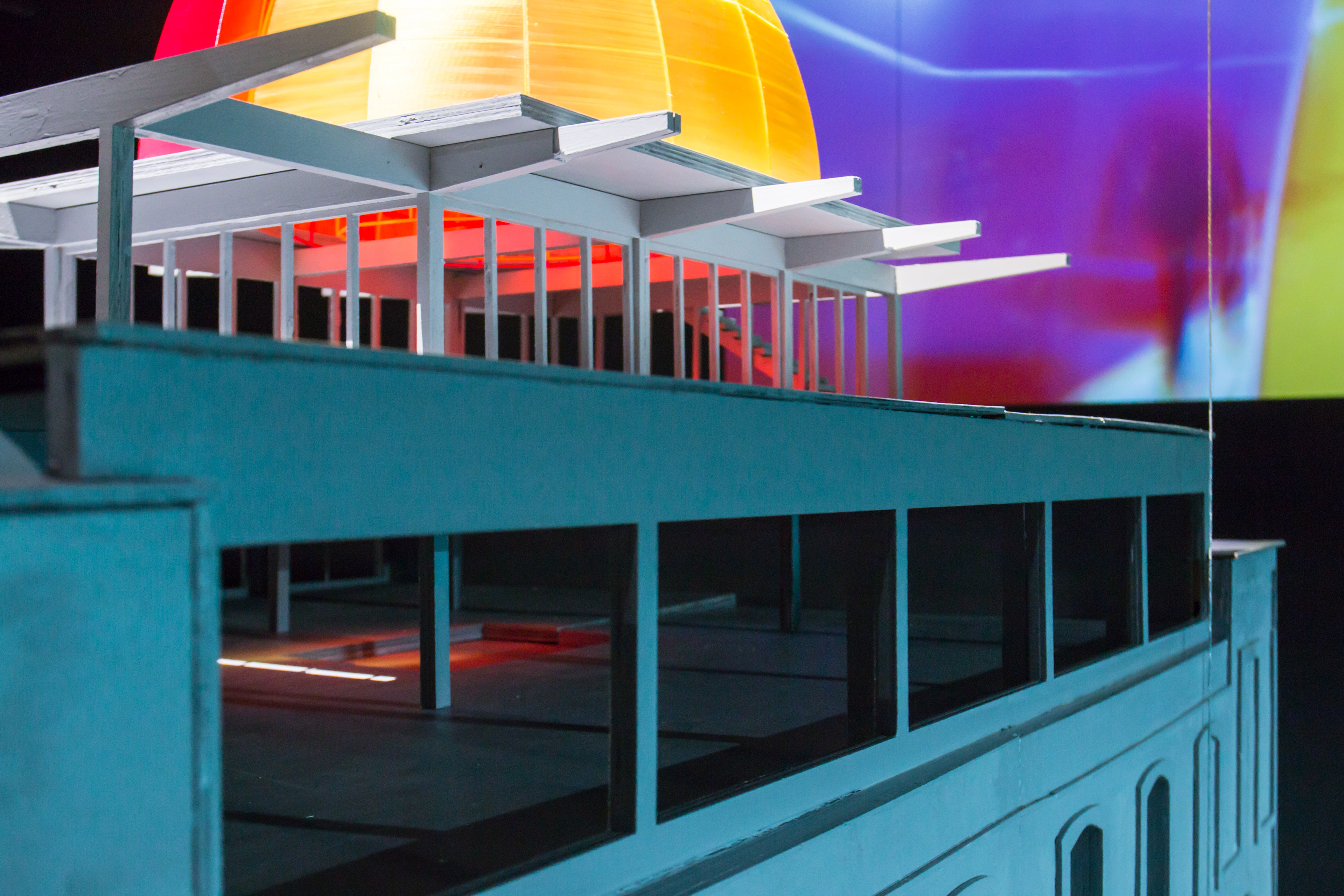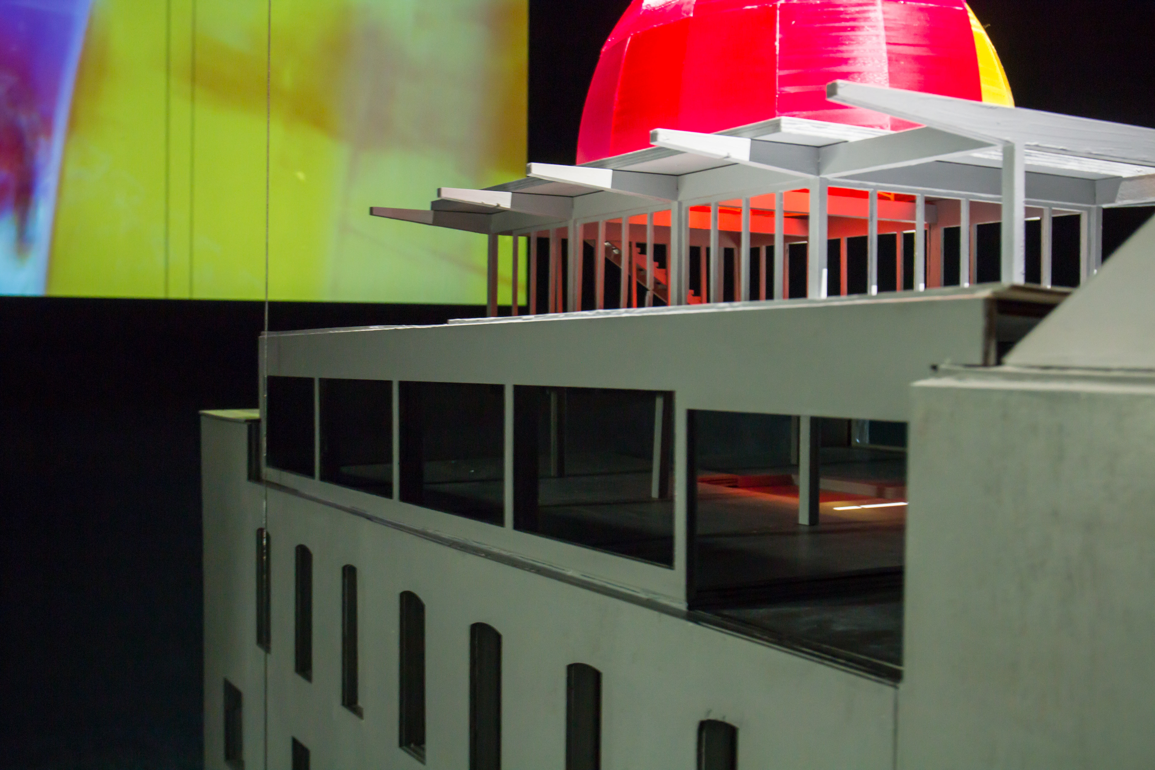 As an extension of the planned co-innovation space in the former Ankerbrotfabrik in Vienna, the declared aim of this project was to create a place of balance that brings people and bees into interaction. In this context, the idea arose to make use of the visual perception of bees. Since bees cannot see red light, a space was designed that only lets red light in through subtractive colour overlays, while ensuring a general permeability for the bees' flight. For deceleration, a spiral path was chosen that leads through two formally identical twisted structures, one covered with magenta and the other with yellow foil. The inner space, bathed in red light, is perceived as dark by the bees, while humans perceive it as red. This creates a space where bees feel calm and can build their nests on the inner structure, while humans can use it for meditation classes and other activities.